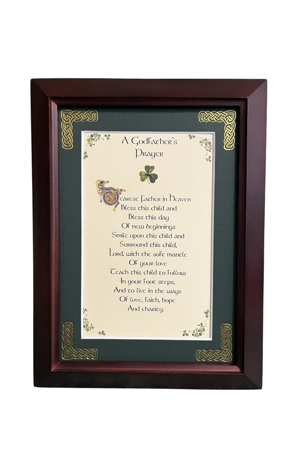 Features - Our blessings are printed on an ivory card, and are presented in a forest green matting with gold Celtic knots, embossed on the corners. Set behind glass and displayed in an elegant dark walnut frame of Italian design. The backing has a hanger and an attached easel to allow for both wall and tabletop display. Each frame comes individually boxed in a bubble wrap sleeve.