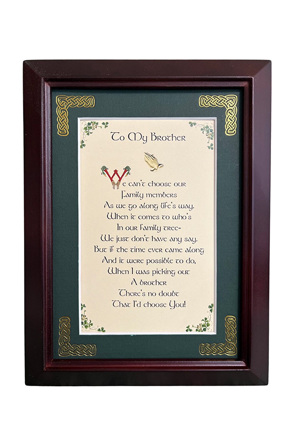 Features - Our blessings are printed on an ivory card, and are presented in a forest green matting with gold Celtic knots, embossed on the corners. Set behind glass and displayed in an elegant dark walnut frame of Italian design. The backing has a hanger and an attached easel to allow for both wall and tabletop display. Each frame comes individually boxed in a bubble wrap sleeve.