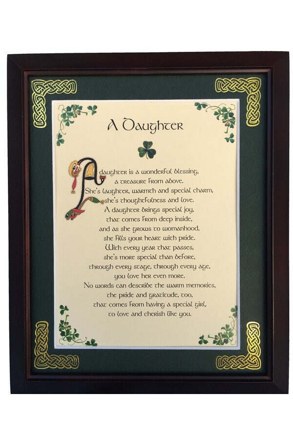 Features - Our blessings are printed on ivory card, and are presented in a forest green matting with gold Celtic knots embossed on the corners. Set behind glass and displayed in a elegant dark walnut frame of Italian design. The backing has a hanger and an attached easel to allow for both wall and tabletop display. Each frame comes individually boxed in a bubble wrap sleeve.