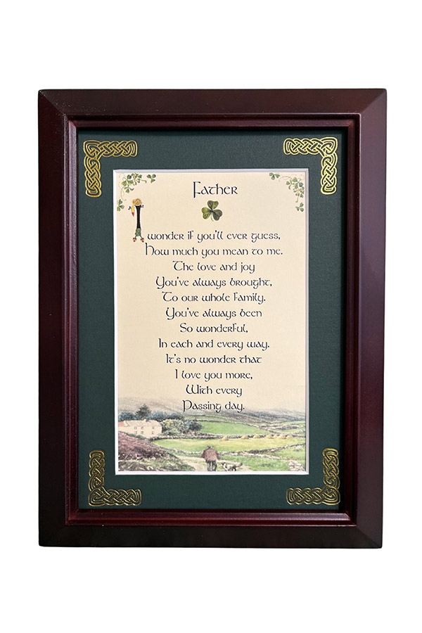 Features - Our blessings are printed on an ivory card, and are presented in a forest green matting with gold Celtic knots, embossed on the corners. Set behind glass and displayed in an elegant dark walnut frame of Italian design. The backing has a hanger and an attached easel to allow for both wall and tabletop display. Each frame comes individually boxed in a bubble wrap sleeve.
