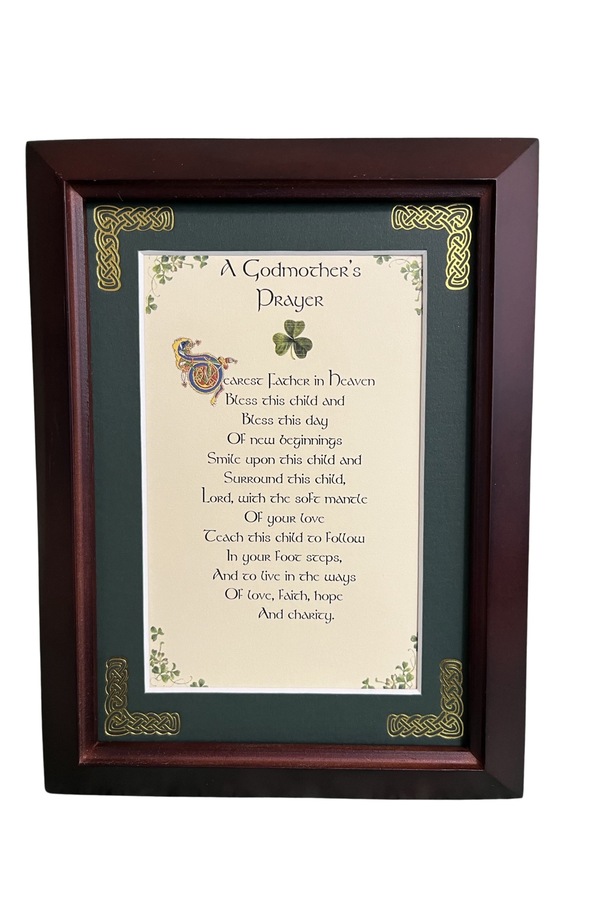Features - Our blessings are printed on an ivory card, and are presented in a forest green matting with gold Celtic knots, embossed on the corners. Set behind glass and displayed in an elegant dark walnut frame of Italian design. The backing has a hanger and an attached easel to allow for both wall and tabletop display. Each frame comes individually boxed in a bubble wrap sleeve.