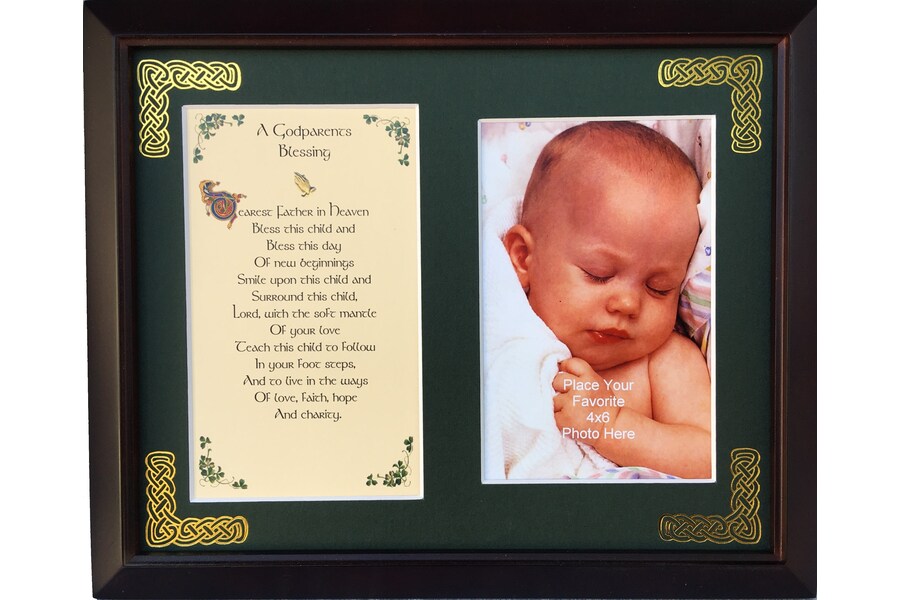 Features - Our blessings are printed on ivory card, and are presented in a forest green matting with gold Celtic knots embossed on the corners. Set behind glass and displayed in a elegant dark walnut frame of Italian design. The backing has a hanger and an attached easel to allow for both wall and table top display. The opening holds a 4x6 photo. Each frame comes individually boxed in a bubble wrap sleeve.