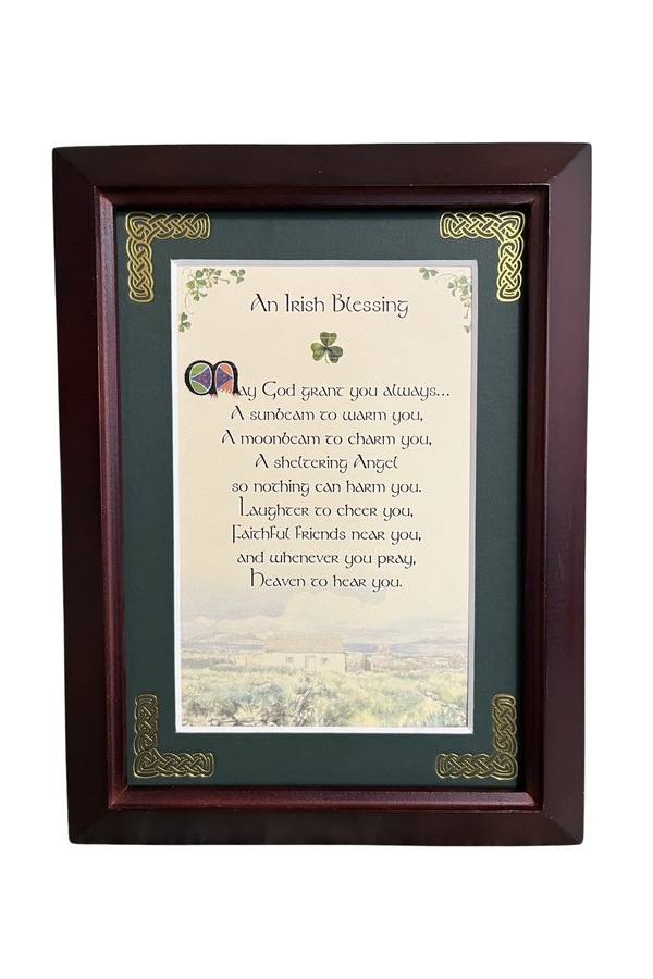 Features - Our blessings are printed on an ivory card, and are presented in a forest green matting with gold Celtic knots, embossed on the corners. Set behind glass and displayed in an elegant dark walnut frame of Italian design. The backing has a hanger and an attached easel to allow for both wall and tabletop display. Each frame comes individually boxed in a bubble wrap sleeve.