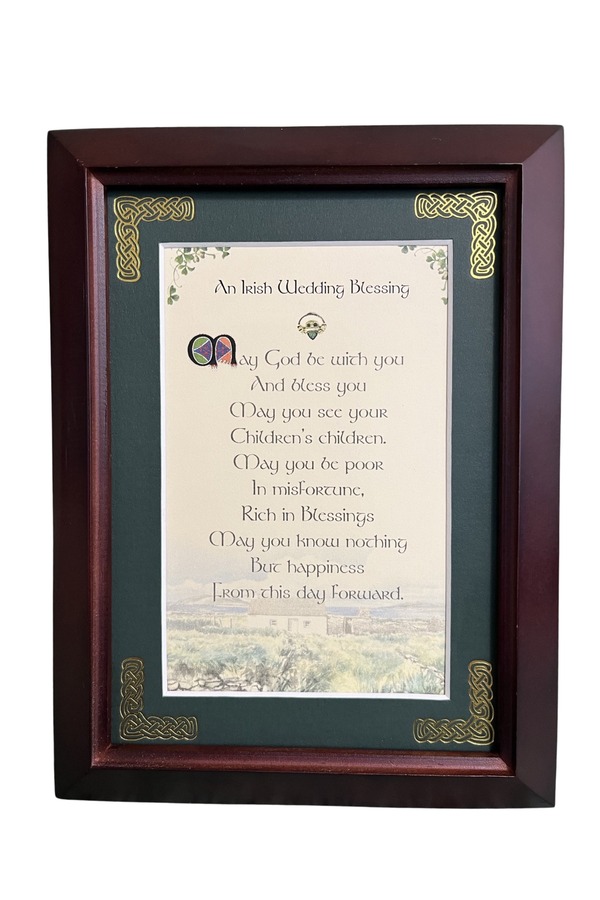 Features - Our blessings are printed on an ivory card, and are presented in a forest green matting with gold Celtic knots, embossed on the corners. Set behind glass and displayed in an elegant dark walnut frame of Italian design. The backing has a hanger and an attached easel to allow for both wall and tabletop display. Each frame comes individually boxed in a bubble wrap sleeve.
