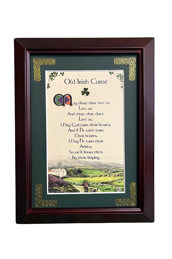 Features - Our blessings are printed on an ivory card, and are presented in a forest green matting with gold Celtic knots, embossed on the corners. Set behind glass and displayed in an elegant dark walnut frame of Italian design. The backing has a hanger and an attached easel to allow for both wall and tabletop display. Each frame comes individually boxed in a bubble wrap sleeve.