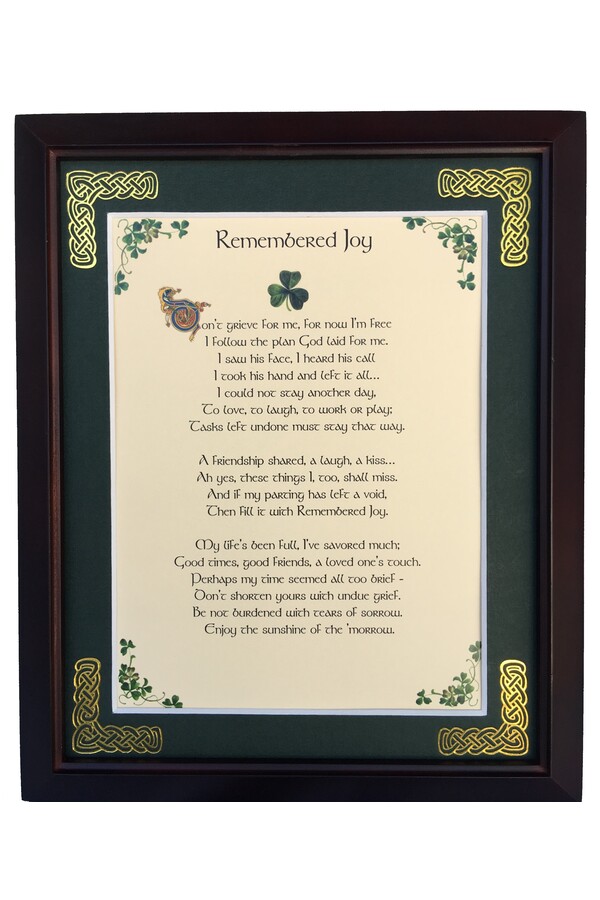 Features - Our blessings are printed on ivory card, and are presented in a forest green matting with gold Celtic knots embossed on the corners. Set behind glass and displayed in a elegant dark walnut frame of Italian design. The backing has a hanger and an attached easel to allow for both wall and tabletop display. Each frame comes individually boxed in a bubble wrap sleeve.
