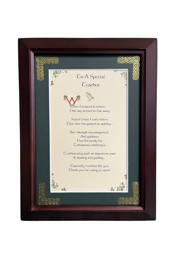 Features - Our blessings are printed on an ivory card, and are presented in a forest green matting with gold Celtic knots, embossed on the corners. Set behind glass and displayed in an elegant dark walnut frame of Italian design. The backing has a hanger and an attached easel to allow for both wall and tabletop display. Each frame comes individually boxed in a bubble wrap sleeve.
