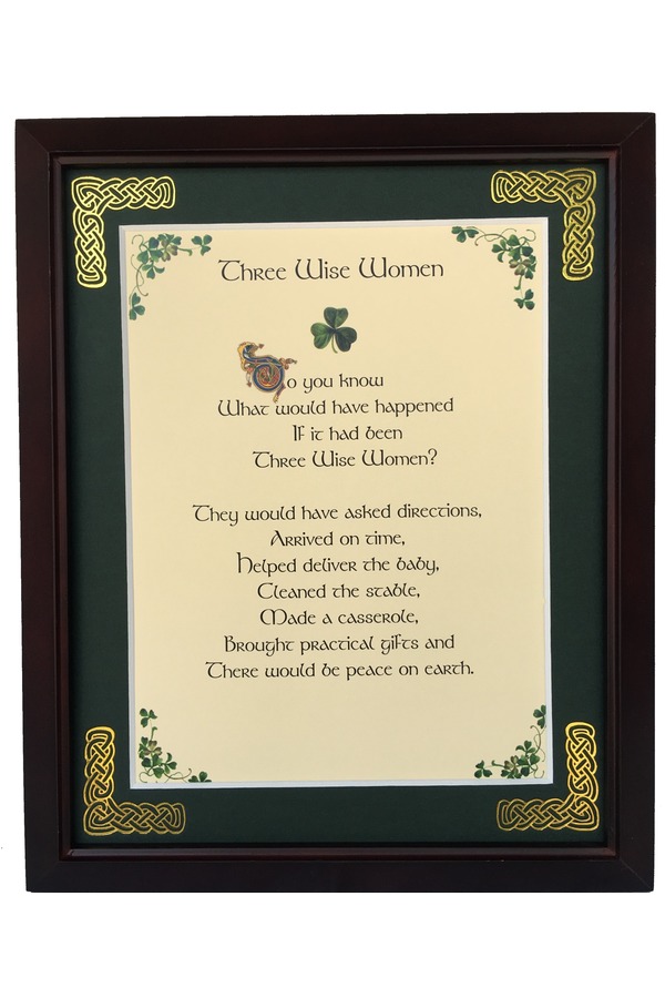Features - Our blessings are printed on ivory card, and are presented in a forest green matting with gold Celtic knots embossed on the corners. Set behind glass and displayed in a elegant dark walnut frame of Italian design. The backing has a hanger and an attached easel to allow for both wall and tabletop display. Each frame comes individually boxed in a bubble wrap sleeve.