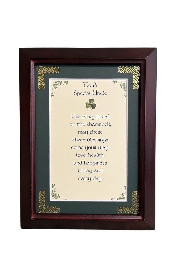 Features - Our blessings are printed on an ivory card, and are presented in a forest green matting with gold Celtic knots, embossed on the corners. Set behind glass and displayed in an elegant dark walnut frame of Italian design. The backing has a hanger and an attached easel to allow for both wall and tabletop display. Each frame comes individually boxed in a bubble wrap sleeve.