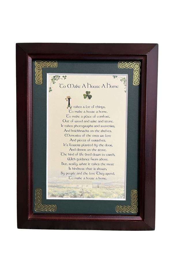 Features - Our blessings are printed on an ivory card, and are presented in a forest green matting with gold Celtic knots, embossed on the corners. Set behind glass and displayed in an elegant dark walnut frame of Italian design. The backing has a hanger and an attached easel to allow for both wall and tabletop display. Each frame comes individually boxed in a bubble wrap sleeve.