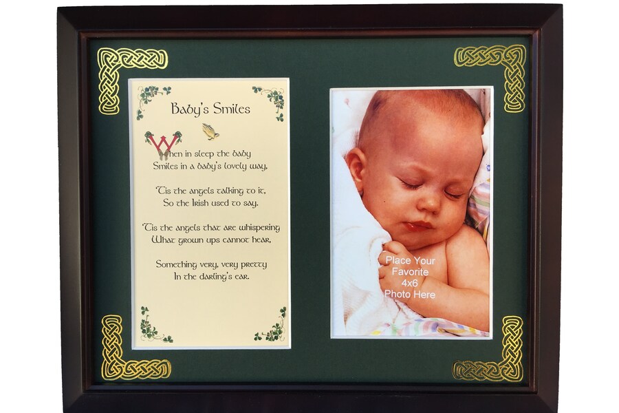 Features - Our blessings are printed on ivory card, and are presented in a forest green matting with gold Celtic knots embossed on the corners. Set behind glass and displayed in a elegant dark walnut frame of Italian design. The backing has a hanger and an attached easel to allow for both wall and table top display. The opening holds a 4x6 photo. Each frame comes individually boxed in a bubble wrap sleeve.