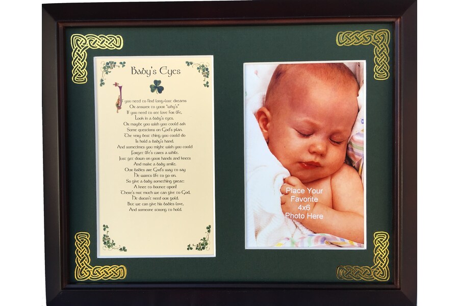 Features - Our blessings are printed on ivory card, and are presented in a forest green matting with gold Celtic knots embossed on the corners. Set behind glass and displayed in a elegant dark walnut frame of Italian design. The backing has a hanger and an attached easel to allow for both wall and table top display. The opening holds a 4x6 photo. Each frame comes individually boxed in a bubble wrap sleeve.