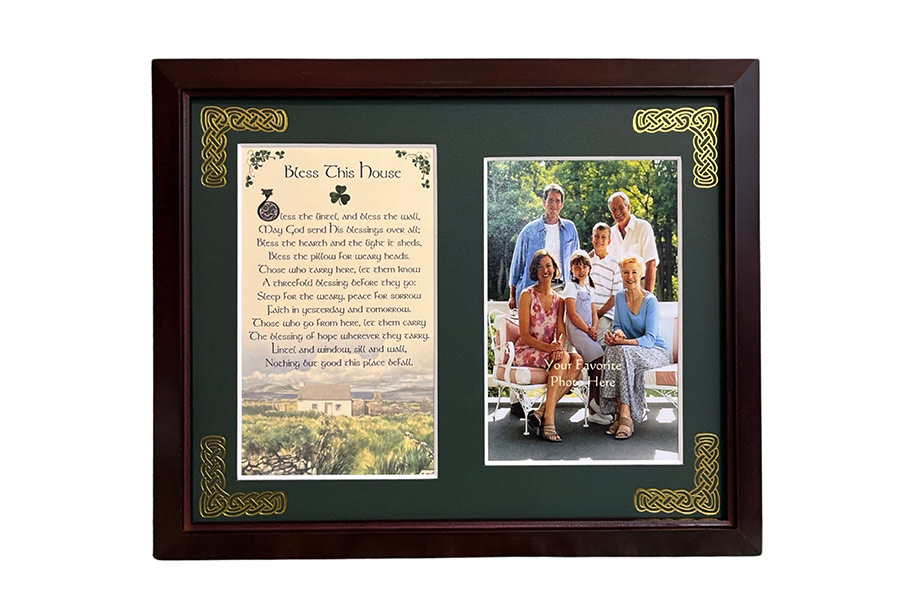 Features - Our blessings are printed on ivory card, and are presented in a forest green matting with gold Celtic knots embossed on the corners. Set behind glass and displayed in a elegant dark walnut frame of Italian design. The backing has a hanger and an attached easel to allow for both wall and table top display. The opening holds a 4x6 photo. Each frame comes individually boxed in a bubble wrap sleeve.