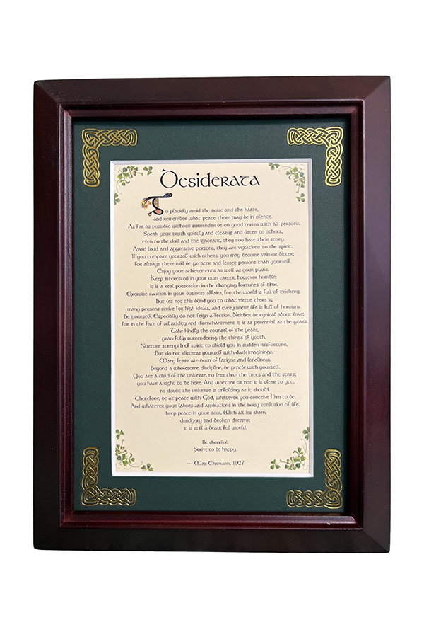 Features - Our blessings are printed on an ivory card, and are presented in a forest green matting with gold Celtic knots, embossed on the corners. Set behind glass and displayed in an elegant dark walnut frame of Italian design. The backing has a hanger and an attached easel to allow for both wall and tabletop display. Each frame comes individually boxed in a bubble wrap sleeve.