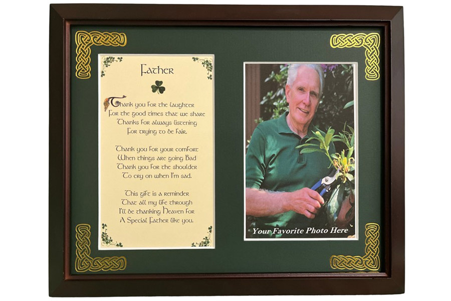 This 8 x 10 inch blessing comes printed on an ivory paper card stock. The photo opening holds a 4x6 inch photograph. The forest green matte has been hand embossed with a Celtic knot work embellishment. The frame is a dark walnut wood frame of Italian design with both an easel and a hanger for display.