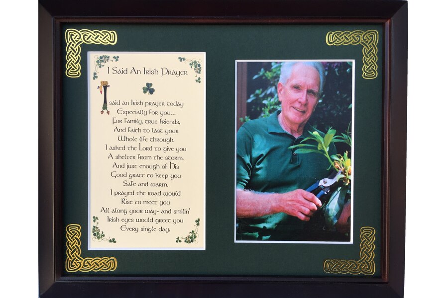 Features - Our blessings are printed on ivory card, and are presented in a forest green matting with gold Celtic knots embossed on the corners. Set behind glass and displayed in a elegant dark walnut frame of Italian design. The backing has a hanger and an attached easel to allow for both wall and table top display. The opening holds a 4x6 photo. Each frame comes individually boxed in a bubble wrap sleeve.