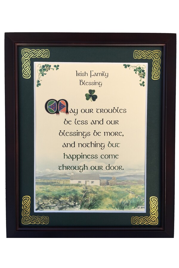 Features - Our blessings are printed on ivory card, and are presented in a forest green matting with gold Celtic knots embossed on the corners. Set behind glass and displayed in a elegant dark walnut frame of Italian design. The backing has a hanger and an attached easel to allow for both wall and tabletop display. Each frame comes individually boxed in a bubble wrap sleeve.