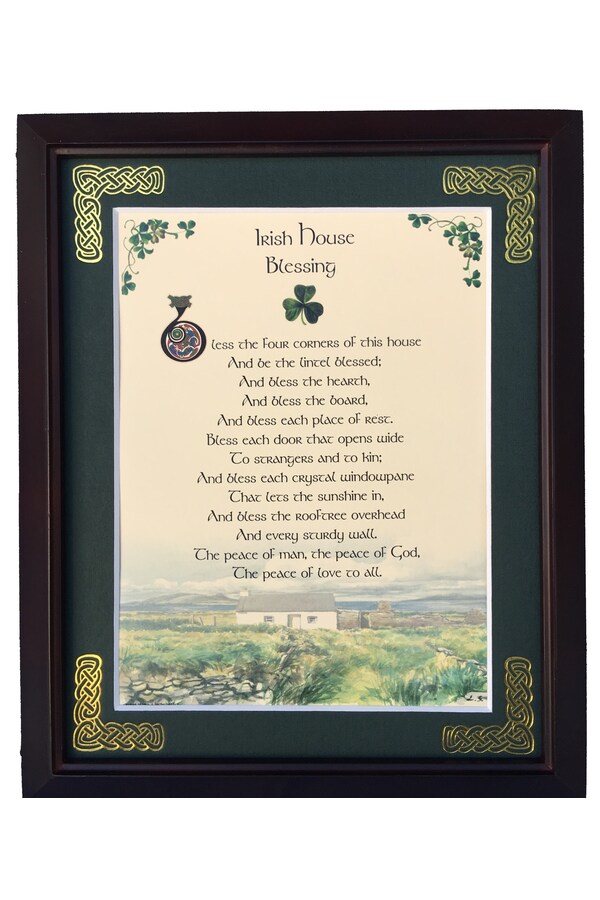 Features - Our blessings are printed on ivory card, and are presented in a forest green matting with gold Celtic knots embossed on the corners. Set behind glass and displayed in a elegant dark walnut frame of Italian design. The backing has a hanger and an attached easel to allow for both wall and tabletop display. Each frame comes individually boxed in a bubble wrap sleeve.