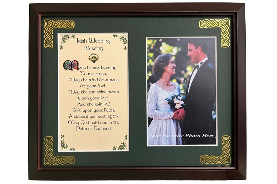This 8 x 10 inch blessing comes printed on an ivory paper card stock. The photo opening holds a 4x6 inch photograph. The forest green matte has been hand embossed with a Celtic knot work embellishment. The frame is a dark walnut wood frame of Italian design with both an easel and a hanger for display.