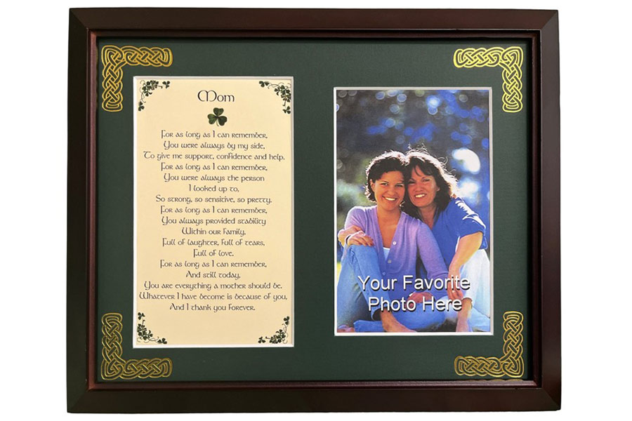 This 8 x 10 inch blessing comes printed on an ivory paper card stock. The photo opening holds a 4x6 inch photograph. The forest green matte has been hand embossed with a Celtic knot work embellishment. The frame is a dark walnut wood frame of Italian design with both an easel and a hanger for display.