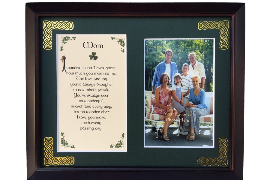 Features - Our blessings are printed on ivory card, and are presented in a forest green matting with gold Celtic knots embossed on the corners. Set behind glass and displayed in a elegant dark walnut frame of Italian design. The backing has a hanger and an attached easel to allow for both wall and table top display. The opening holds a 4x6 photo. Each frame comes individually boxed in a bubble wrap sleeve.