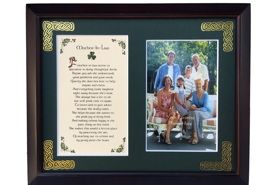 Features - Our blessings are printed on ivory card, and are presented in a forest green matting with gold Celtic knots embossed on the corners. Set behind glass and displayed in a elegant dark walnut frame of Italian design. The backing has a hanger and an attached easel to allow for both wall and table top display. The opening holds a 4x6 photo. Each frame comes individually boxed in a bubble wrap sleeve.