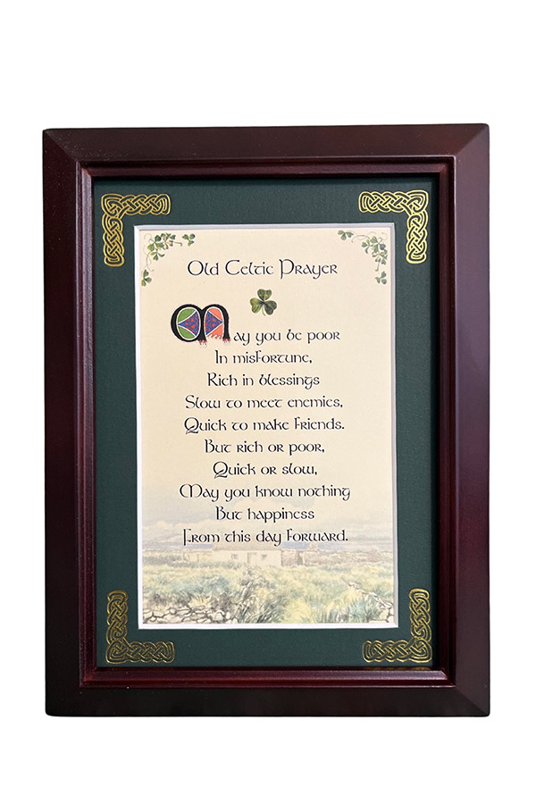 Features - Our blessings are printed on an ivory card, and are presented in a forest green matting with gold Celtic knots, embossed on the corners. Set behind glass and displayed in an elegant dark walnut frame of Italian design. The backing has a hanger and an attached easel to allow for both wall and tabletop display. Each frame comes individually boxed in a bubble wrap sleeve.