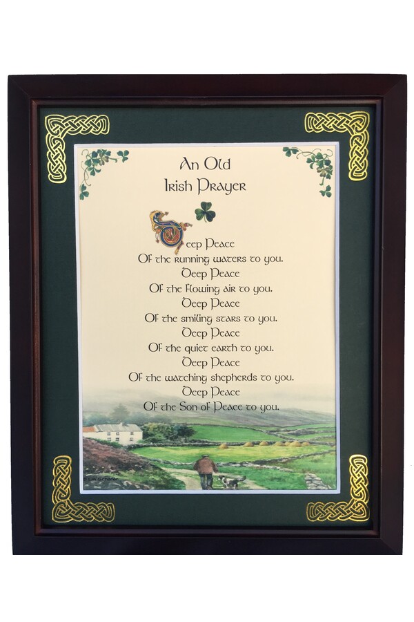 Features - Our blessings are printed on ivory card, and are presented in a forest green matting with gold Celtic knots embossed on the corners. Set behind glass and displayed in a elegant dark walnut frame of Italian design. The backing has a hanger and an attached easel to allow for both wall and tabletop display. Each frame comes individually boxed in a bubble wrap sleeve.