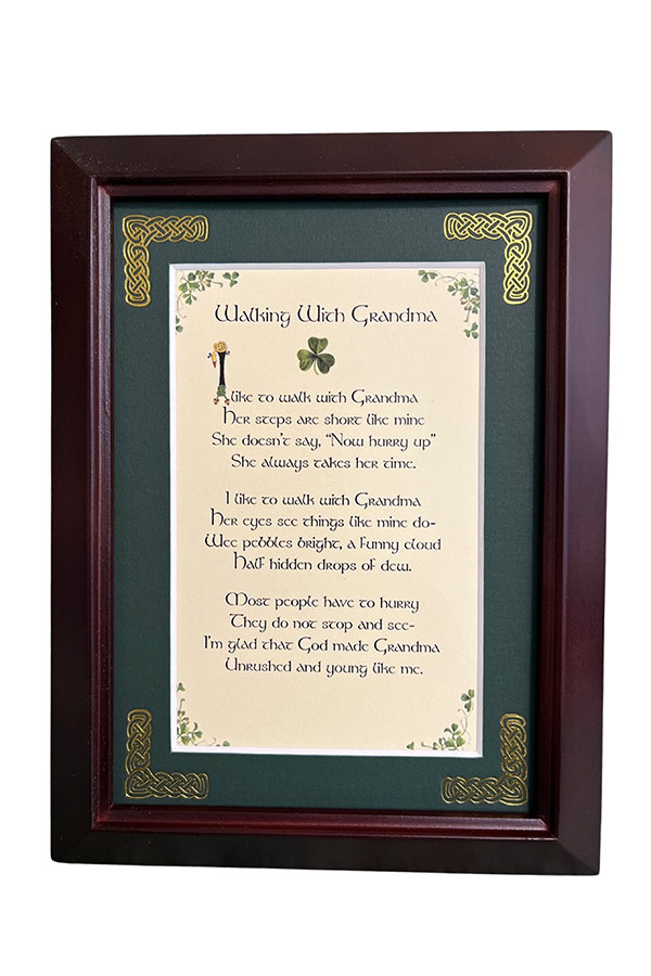 Features - Our blessings are printed on an ivory card, and are presented in a forest green matting with gold Celtic knots, embossed on the corners. Set behind glass and displayed in an elegant dark walnut frame of Italian design. The backing has a hanger and an attached easel to allow for both wall and tabletop display. Each frame comes individually boxed in a bubble wrap sleeve.