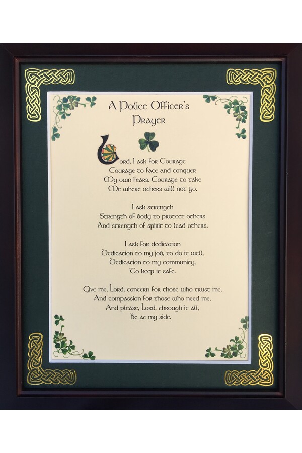 Features - Our blessings are printed on ivory card, and are presented in a forest green matting with gold Celtic knots embossed on the corners. Set behind glass and displayed in a elegant dark walnut frame of Italian design. The backing has a hanger and an attached easel to allow for both wall and tabletop display. Each frame comes individually boxed in a bubble wrap sleeve.