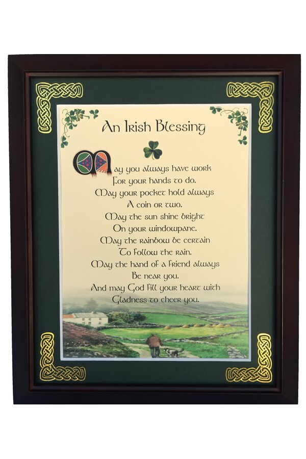 Features - Our blessings are printed on ivory card, and are presented in a forest green matting with gold Celtic knots embossed on the corners. Set behind glass and displayed in a elegant dark walnut frame of Italian design. The backing has a hanger and an attached easel to allow for both wall and tabletop display. Each frame comes individually boxed in a bubble wrap sleeve.