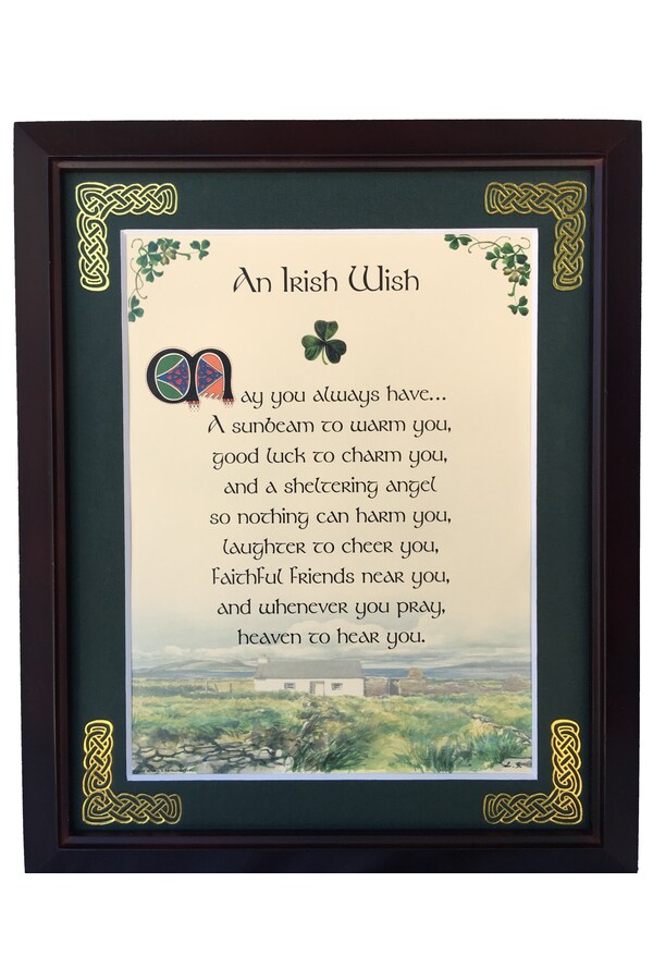Features - Our blessings are printed on ivory card, and are presented in a forest green matting with gold Celtic knots embossed on the corners. Set behind glass and displayed in a elegant dark walnut frame of Italian design. The backing has a hanger and an attached easel to allow for both wall and tabletop display. Each frame comes individually boxed in a bubble wrap sleeve.