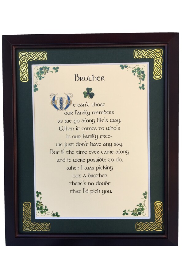 Features - Our blessings are printed on ivory card, and are presented in a forest green matting with gold Celtic knots embossed on the corners. Set behind glass and displayed in a elegant dark walnut frame of Italian design. The backing has a hanger and an attached easel to allow for both wall and tabletop display. Each frame comes individually boxed in a bubble wrap sleeve.