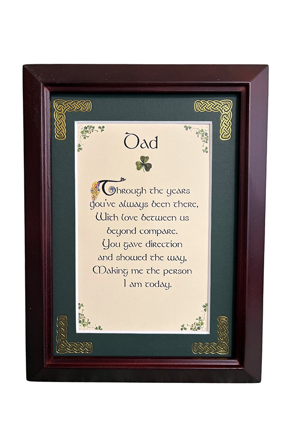 Features - Our blessings are printed on an ivory card, and are presented in a forest green matting with gold Celtic knots, embossed on the corners. Set behind glass and displayed in an elegant dark walnut frame of Italian design. The backing has a hanger and an attached easel to allow for both wall and tabletop display. Each frame comes individually boxed in a bubble wrap sleeve.
