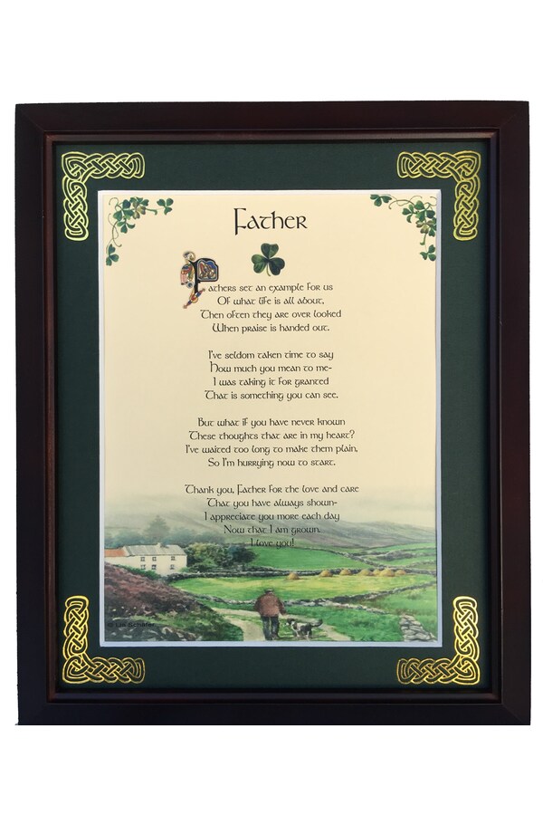 Features - Our blessings are printed on ivory card, and are presented in a forest green matting with gold Celtic knots embossed on the corners. Set behind glass and displayed in a elegant dark walnut frame of Italian design. The backing has a hanger and an attached easel to allow for both wall and tabletop display. Each frame comes individually boxed in a bubble wrap sleeve.