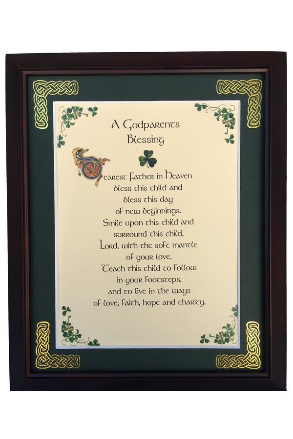 Features - Our blessings are printed on ivory card, and are presented in a forest green matting with gold Celtic knots embossed on the corners. Set behind glass and displayed in a elegant dark walnut frame of Italian design. The backing has a hanger and an attached easel to allow for both wall and tabletop display. Each frame comes individually boxed in a bubble wrap sleeve.