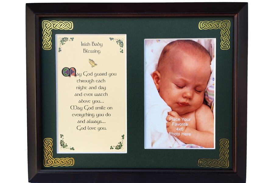 Features - Our blessings are printed on ivory card, and are presented in a forest green matting with gold Celtic knots embossed on the corners. Set behind glass and displayed in a elegant dark walnut frame of Italian design. The backing has a hanger and an attached easel to allow for both wall and table top display. The opening holds a 4x6 photo. Each frame comes individually boxed in a bubble wrap sleeve.