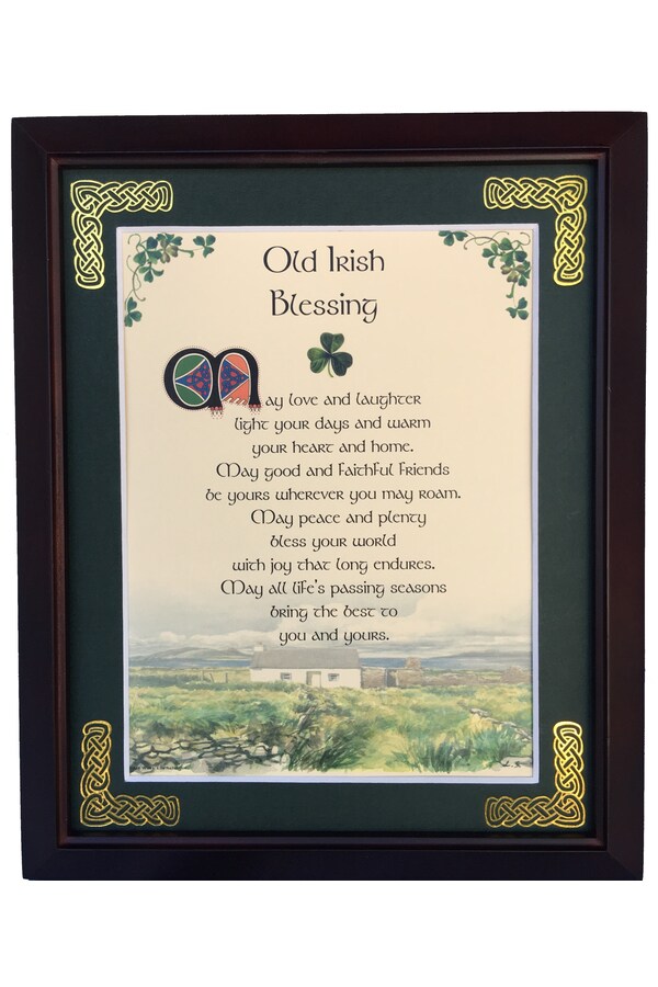 Features - Our blessings are printed on ivory card, and are presented in a forest green matting with gold Celtic knots embossed on the corners. Set behind glass and displayed in a elegant dark walnut frame of Italian design. The backing has a hanger and an attached easel to allow for both wall and tabletop display. Each frame comes individually boxed in a bubble wrap sleeve.