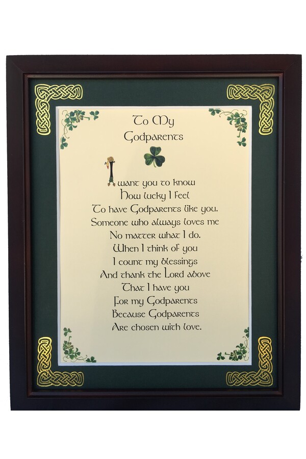 Features - Our blessings are printed on ivory card, and are presented in a forest green matting with gold Celtic knots embossed on the corners. Set behind glass and displayed in a elegant dark walnut frame of Italian design. The backing has a hanger and an attached easel to allow for both wall and tabletop display. Each frame comes individually boxed in a bubble wrap sleeve.