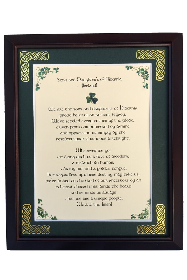 Features - Our blessings are printed on ivory card, and are presented in a forest green matting with gold Celtic knots embossed on the corners. Set behind glass and displayed in a elegant dark walnut frame of Italian design. The backing has a hanger and an attached easel to allow for both wall and tabletop display. Each frame comes individually boxed in a bubble wrap sleeve.