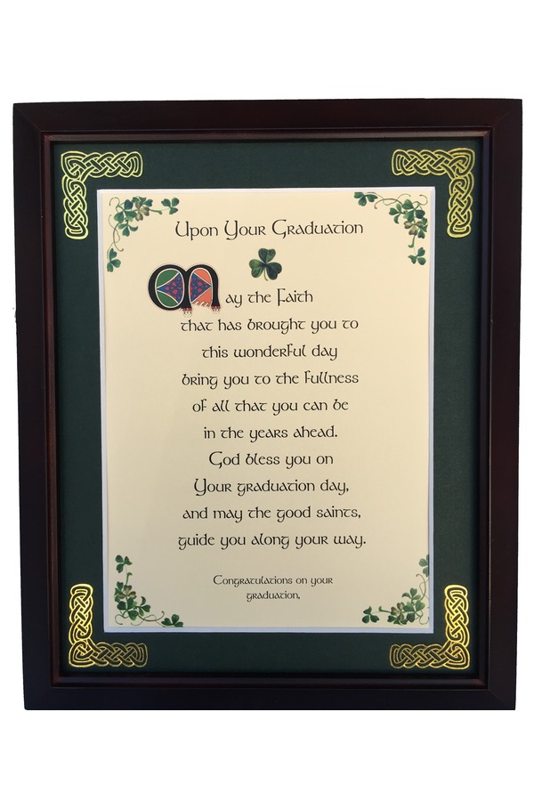 Features - Our blessings are printed on ivory card, and are presented in a forest green matting with gold Celtic knots embossed on the corners. Set behind glass and displayed in a elegant dark walnut frame of Italian design. The backing has a hanger and an attached easel to allow for both wall and tabletop display. Each frame comes individually boxed in a bubble wrap sleeve.