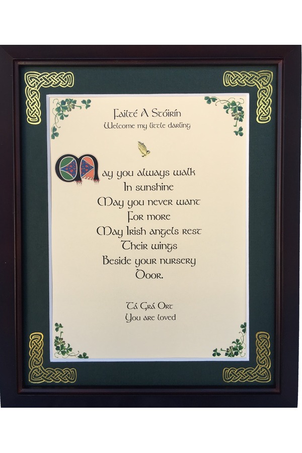 Features - Our blessings are printed on ivory card, and are presented in a forest green matting with gold Celtic knots embossed on the corners. Set behind glass and displayed in a elegant dark walnut frame of Italian design. The backing has a hanger and an attached easel to allow for both wall and tabletop display. Each frame comes individually boxed in a bubble wrap sleeve.