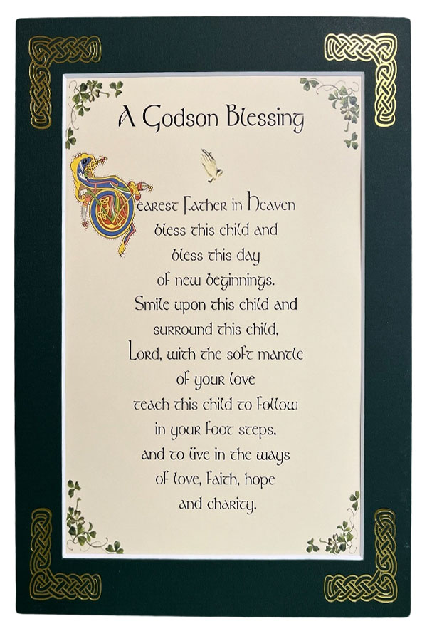 Features - Our blessings are printed on ivory card and are presented in a forest green matting with gold Celtic knots embossed on the corners. Presented in a clear with a craft card backing in a resealable bag.