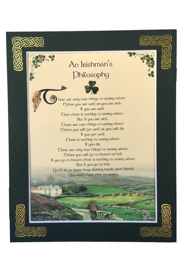 Features - Our blessings are printed on ivory card and are presented in a forest green matting with gold Celtic knots embossed on the corners. Presented in a clear with a craft card backing in a resealable bag.