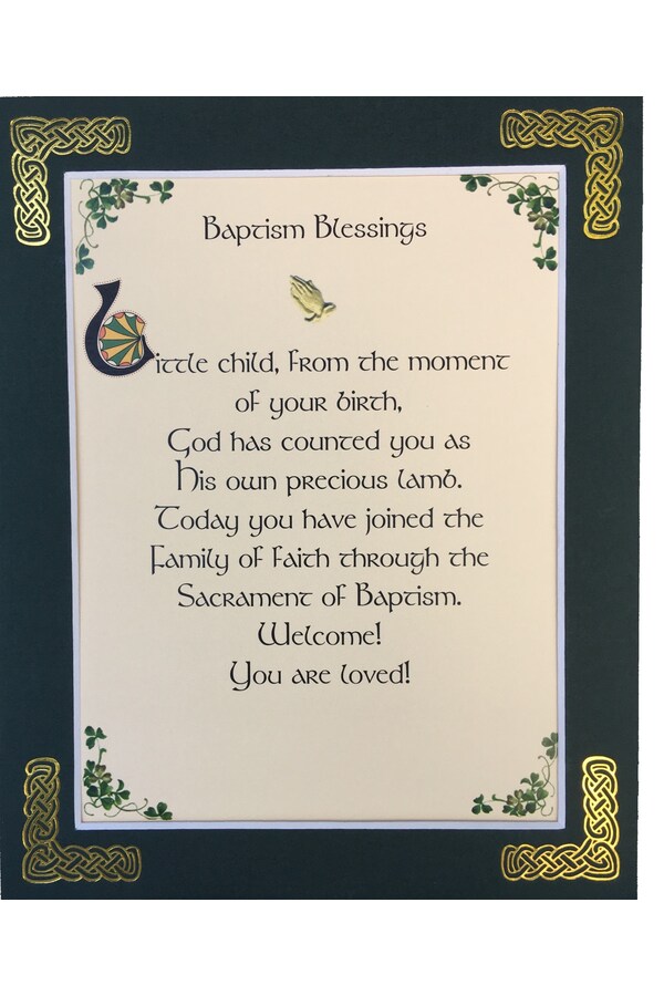 Features - Our blessings are printed on ivory card and are presented in a forest green matting with gold Celtic knots embossed on the corners. Presented in a clear with a craft card backing in a resealable bag.