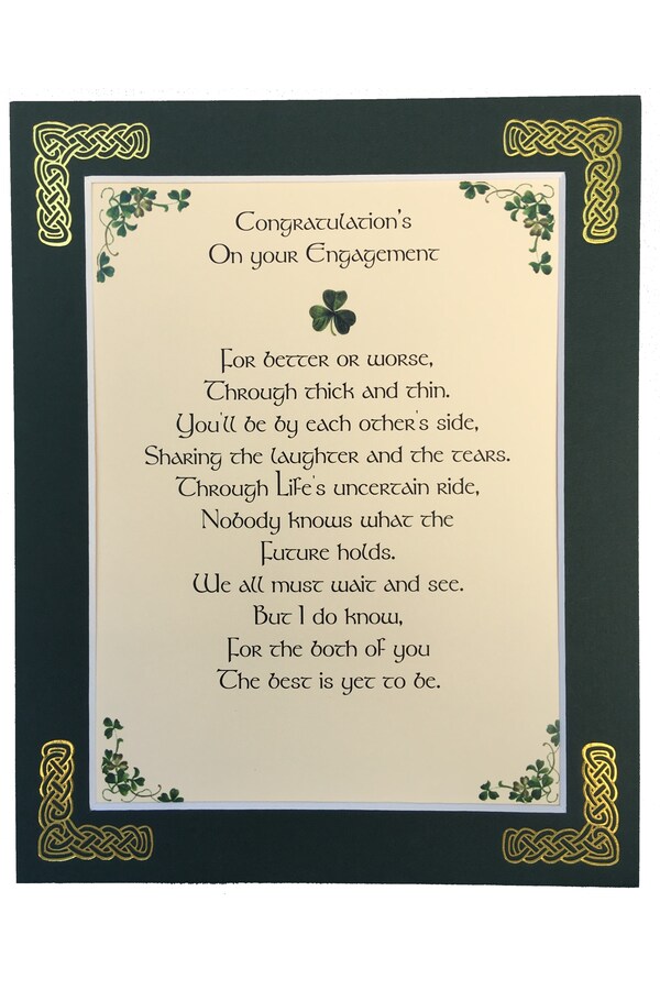 Features - Our blessings are printed on ivory card and are presented in a forest green matting with gold Celtic knots embossed on the corners. Presented in a clear with a craft card backing in a resealable bag.