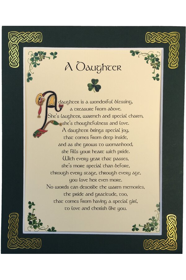 Features - Our blessings are printed on ivory card and are presented in a forest green matting with gold Celtic knots embossed on the corners. Presented in a clear with a craft card backing in a resealable bag.