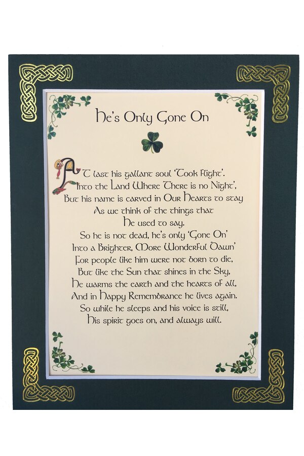 Features - Our blessings are printed on ivory card and are presented in a forest green matting with gold Celtic knots embossed on the corners. Presented in a clear with a craft card backing in a resealable bag.