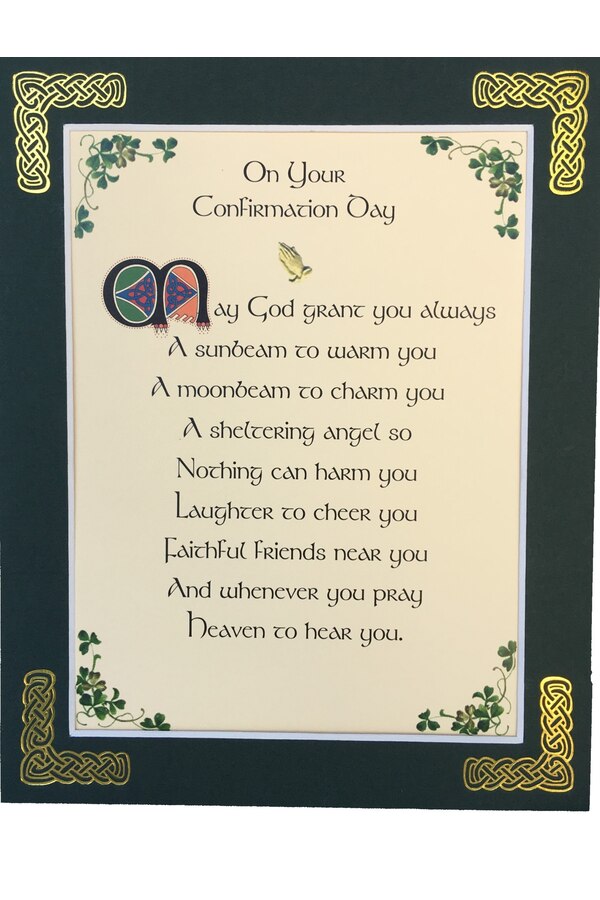Features - Our blessings are printed on ivory card and are presented in a forest green matting with gold Celtic knots embossed on the corners. Presented in a clear with a craft card backing in a resealable bag.