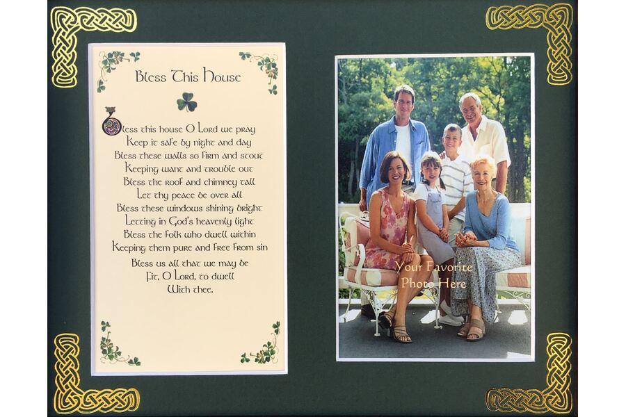 Features - Our blessings printed on ivory card are presented in a forest green matting with gold Celtic knots embossed on the corners. The opening holds a 4x6 photo. Each matt comes in a resealable sleeve.
